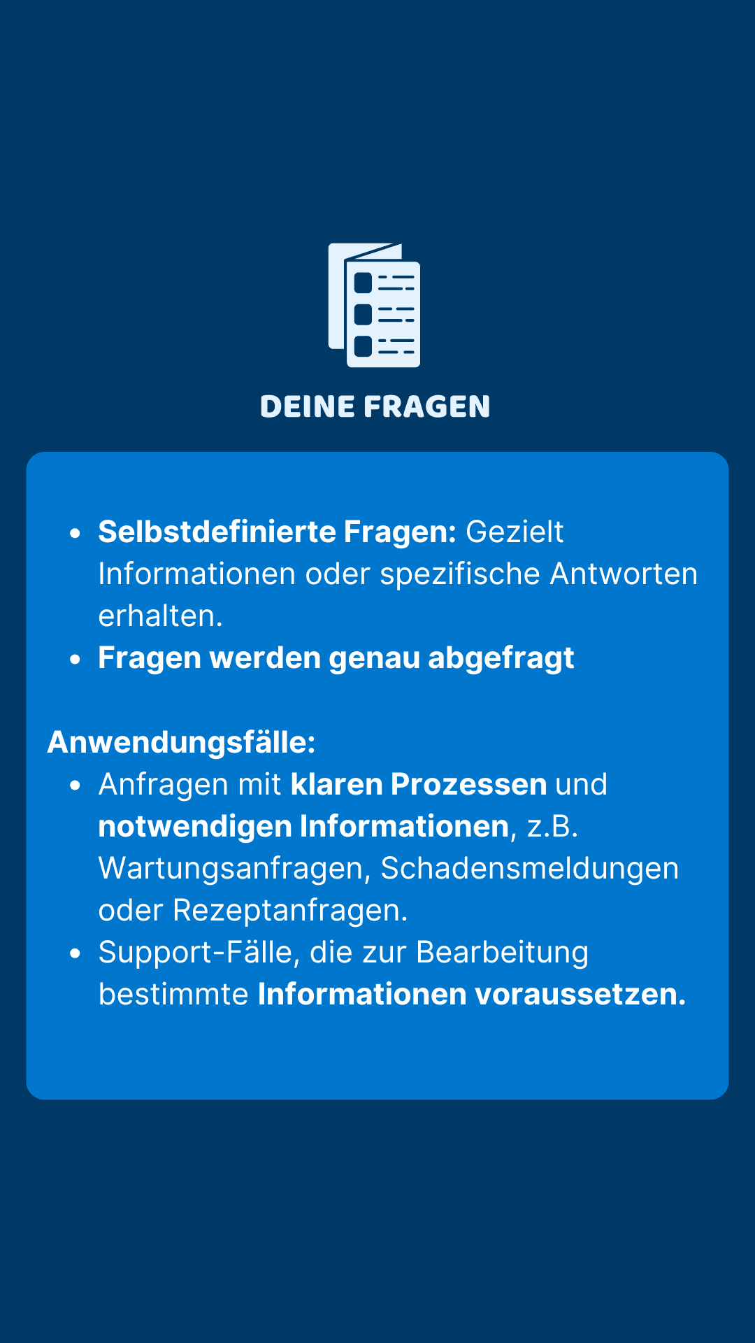 Der Anfragemodus Deine Fragen wird idealerweise verwendet, um standardisierte Anfragen zu bearbeiten. Hierbei werden exakt die Fragen gestellt, die du in den Einstellungen des Anfragetyps hinterlegst.