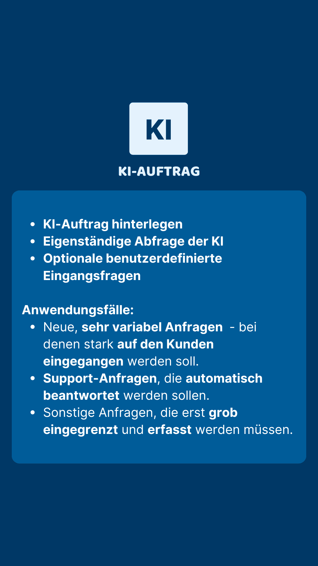Der Anfragemodus KI-Auftrag wird idealerweise verwendet, um offene Fragestellungen bzw. sehr individuelle Anfragen zu bearbeiten. Hierbei geht die meiti KI dynamisch auf die Nachrichten deiner Kunden ein und folgt deinen spezifischen Vorgaben.