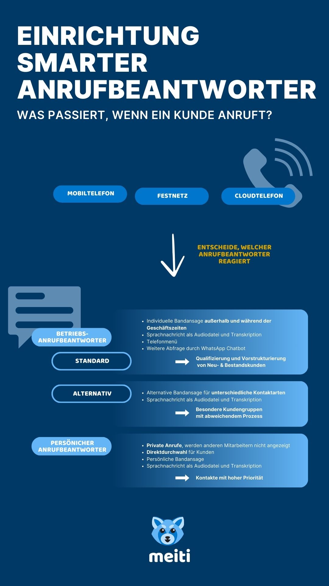 Die Smart Voicemail von meiti bietet weit mehr als ein herkömmlicher Anrufbeantworter. Durch die Kombination aus einem intelligenten Anrufbeantworter und einem WhatsApp KI-Chatbot sorgt meiti dafür, dass keine Kundenanfrage unbeantwortet bleibt. Anrufer können ihr Anliegen direkt per Telefonmenü und Sprachnachricht hinterlassen. Im Anschluss werden sie umgehend vom KI Chatbot kontaktiert, der weitere Informationen und Kontaktdaten per WhatsApp abfragt. In der meiti App erhältst du eine Zusammenfassung der gesamten Anfrage sowie die Sprachnachricht als Audiodatei und Transkription.