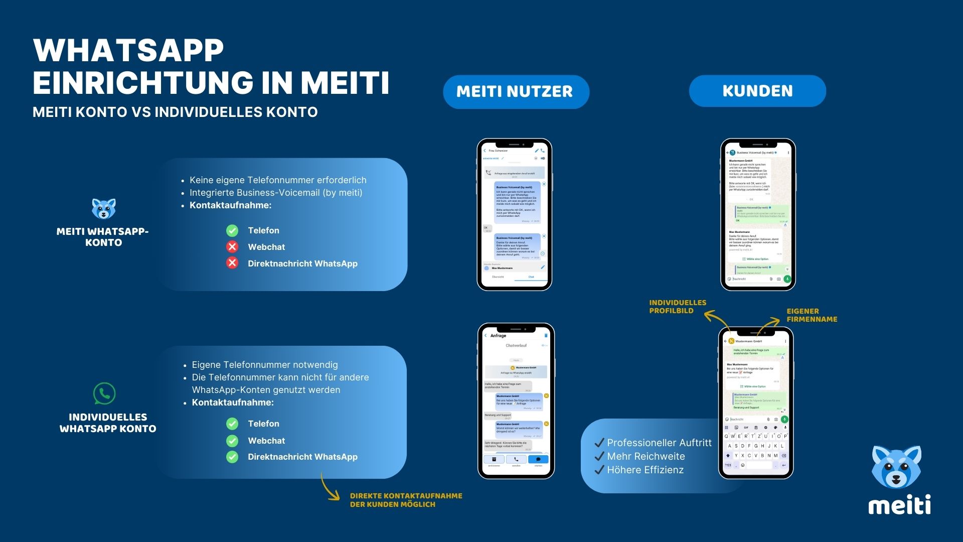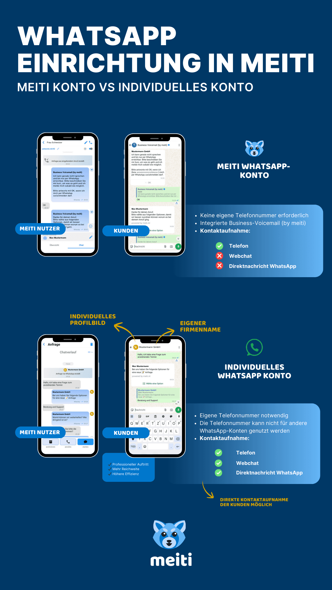 Und um den vollen Funktionsumfang von meiti verwenden zu können sowie eine überragende Kundenerfahrung sicherzustellen, empfehlen wir dir einen individuellen WhatsApp Account zu erstellen.